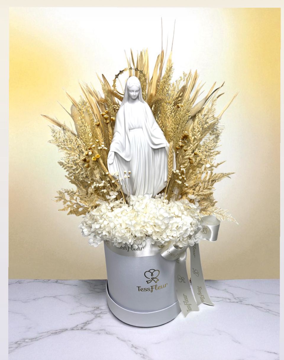 Uma linda Big Box com flores Naturais preservadas, formando um lindo e eterno jardim de flores sob os pés da escultura Nossa Senhora das Graças, feita em Pó de Mármore.