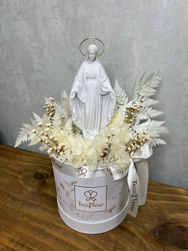 Uma exclusiva Box com estampa personalizada, contendo um sofisticado arranjo de flores naturais preservadas, que garantem beleza e durabilidade ao seu ambiente. Como destaque, uma elegante escultura de Nossa Senhora das Graças, feita em pó de mármore com auréola dourada, trazendo um toque de serenidade e fé. Ideal para presentear ou decorar com devoção e estilo.