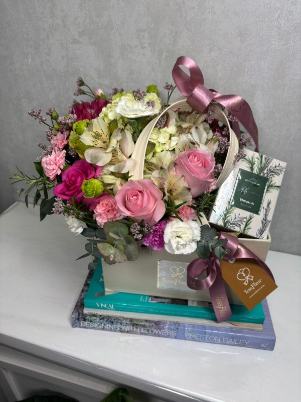 Uma elegante bag com flores em tons de rosa e branco e uma vela aromática.
