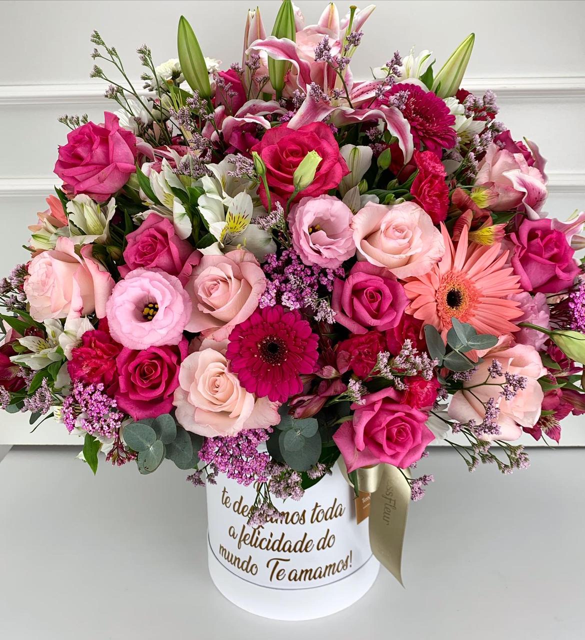 Um big box repleto de flores delicadas, indispensável para comemorar datas especiais, com lírios, rosas, lisianthus e uma variedade linda de flores.