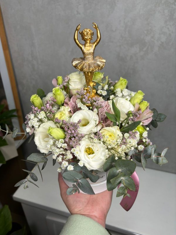 Uma linda e delicada box de flores acompanhada de uma bailarina em resina dourada.