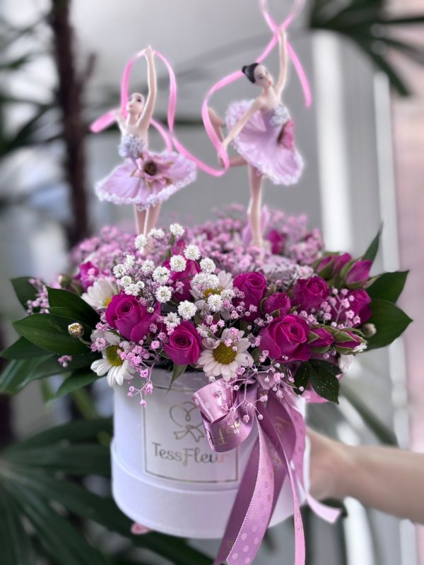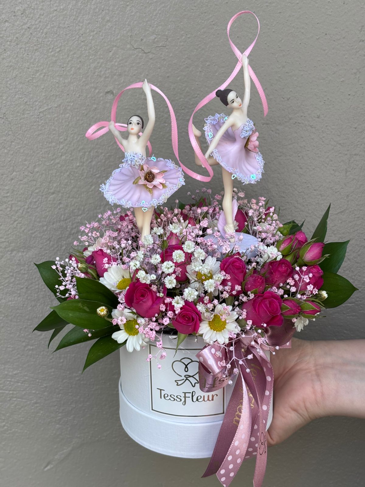 Um delicado arranjo de mini rosas e duas mini Bailarinas encantadoras.