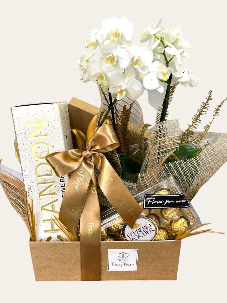 box com orquidea branca, chocolte ferrero rocher com 12 unidades e espumante.