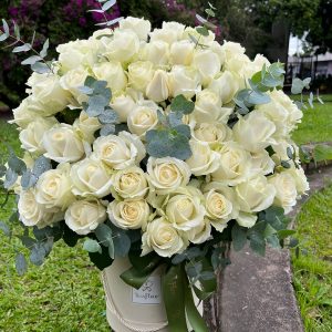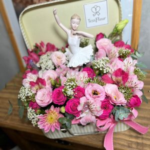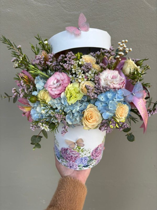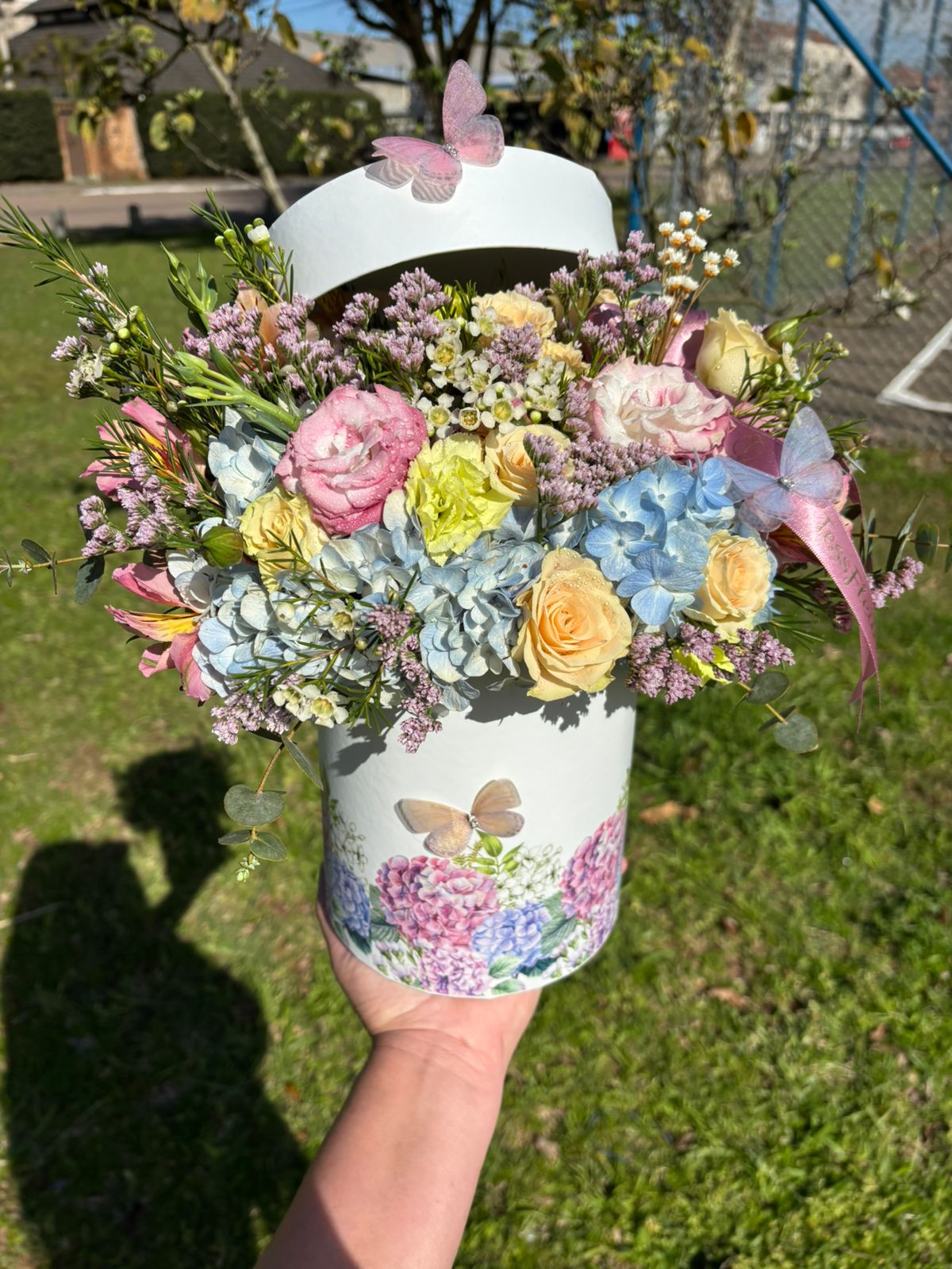 Uma linda caixa com estampas florais e um belo e delicado arranjo de flores.
