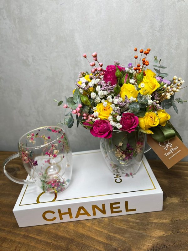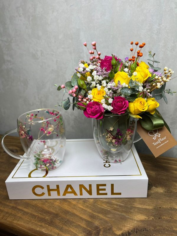 Acompanhada de um elegante arranjo de flores mistas, a caneca de parede dupla da renomada marca WOLFF é feita de vidro Borossilicato, sendo o equilíbrio perfeito entre o design sofisticado e a alta performance. Com capacidade para 350ml, essa caneca é ideal para desfrutar de bebidas quentes ou frias com estilo e praticidade.