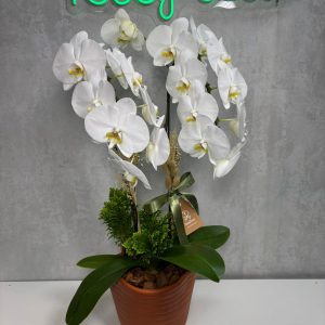 Um lindo arranjo de mini Orquídeas acompanhado de um sofisticado vaso feito em cerâmica Holandesa.