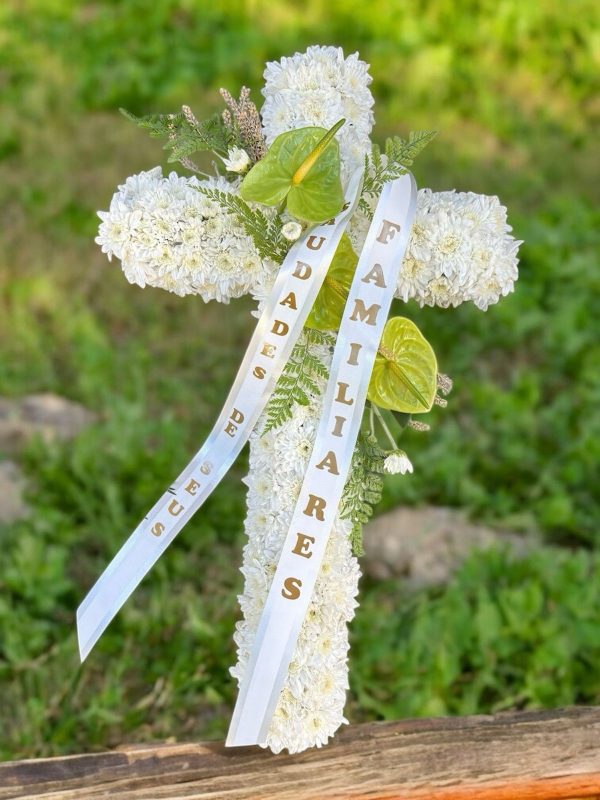 Com flores brancas que representam a pureza e a serenidade, este arranjo em formato de cruz é uma escolha digna e respeitosa para oferecer condolências. Um tributo sutil e cheio de significado, perfeito para momentos de despedida.