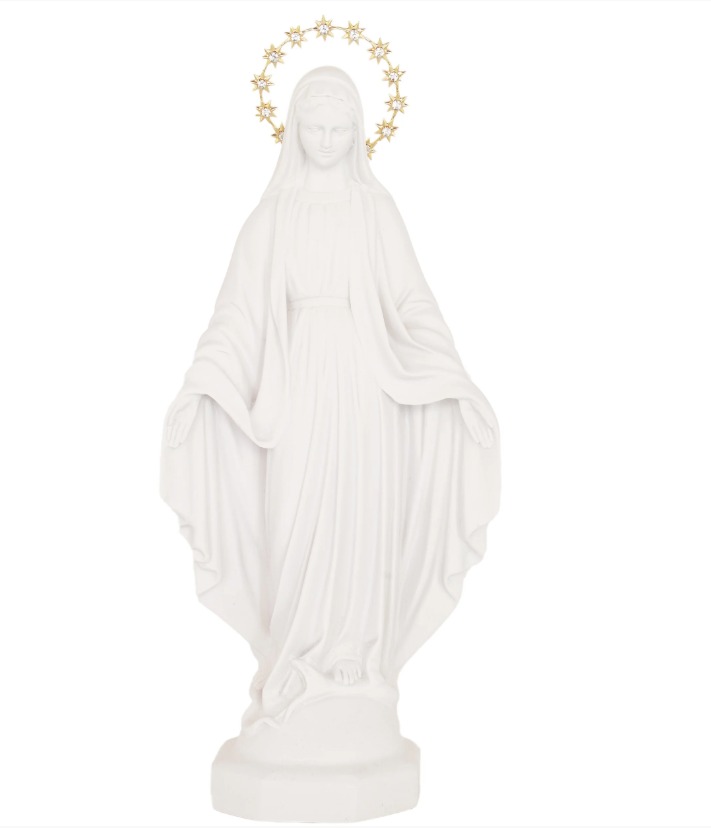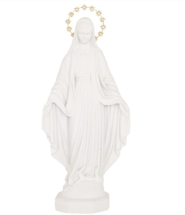 Nossa Senhora das Graças é conhecida por sua representação com um manto de luz e mãos estendidas, simbolizando a distribuição de bênçãos e graças aos fiéis. Nesta escultura feita de Mármore em Pó, cada detalhe foi cuidadosamente esculpido para refletir esses atributos, criando um ponto focal de contemplação e devoção. A figura serena e acolhedora da santa oferece um lembrete constante da presença divina e da proteção que ela proporciona aos seus devotos.