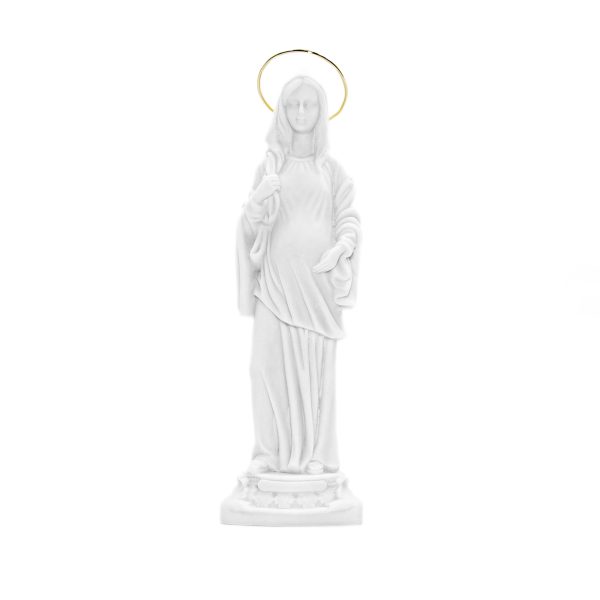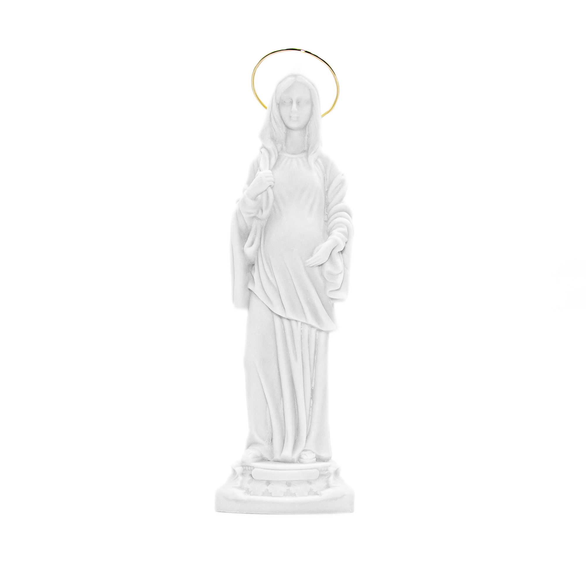 A imagem de Nossa Senhora da Grávida, com seu ventre em evidência, é um poderoso símbolo de esperança, expectativa e a promessa de novos começos. Este gesto sagrado celebra a maternidade e a capacidade de gerar vida, além de servir como um lembrete constante da proteção e da orientação divina. Cada detalhe desta escultura, feita em Pó de Mármore, foi cuidadosamente esculpido para refletir a serenidade e a devoção associadas à santa, criando um ponto focal de contemplação e inspiração.