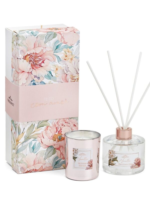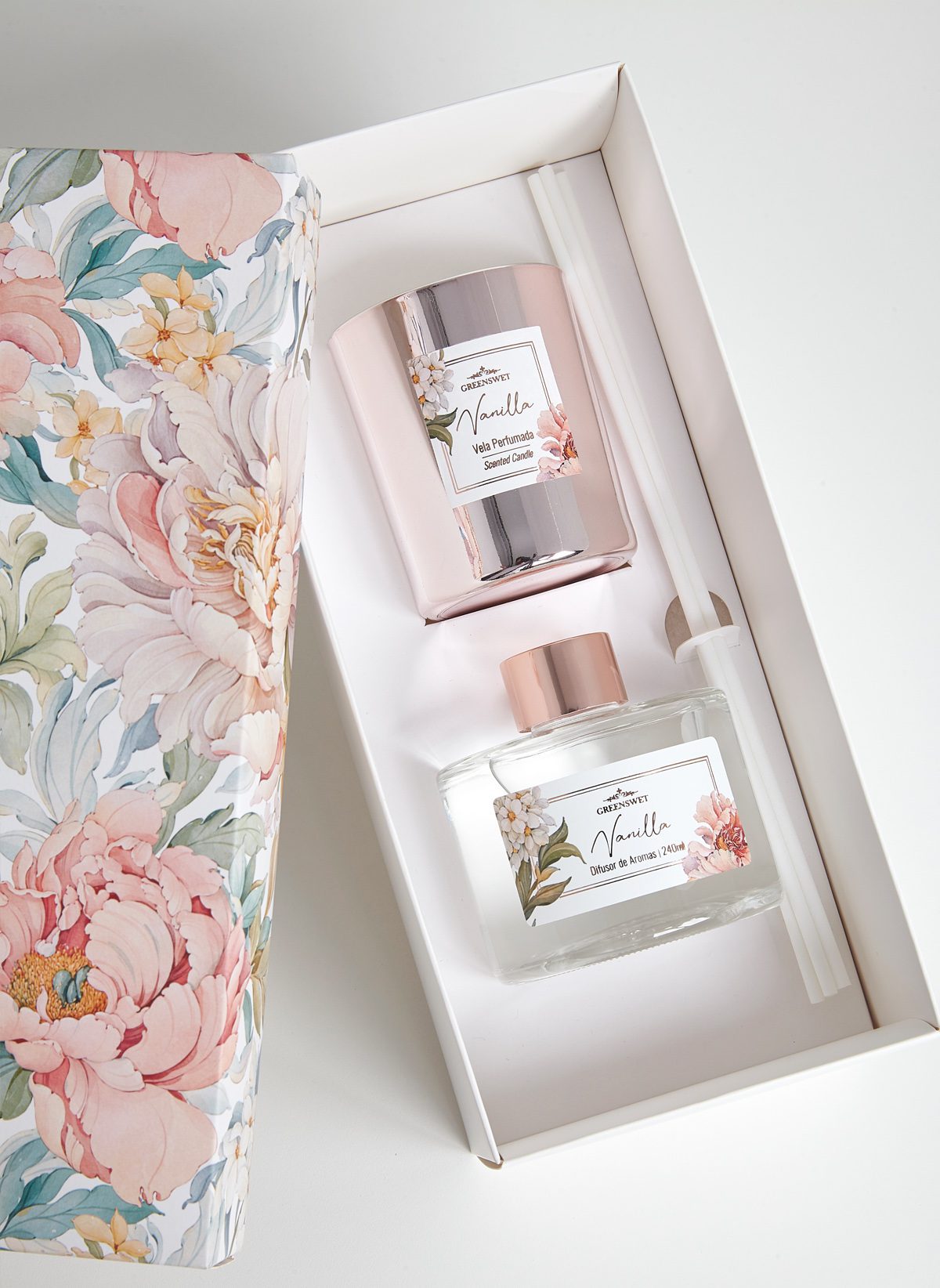 KIT CONTÉM: 01 Difusor de Aromas 250ml Essência Vanilla 01 Vela Perfumada 180g Essência Vanilla 01 Caixa tema Floral (medida: 27,50 x 12,00 x 7,50cm)